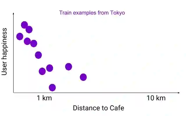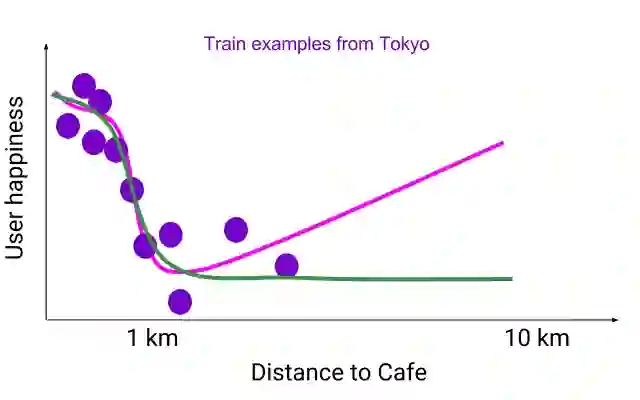 下图中我们展示了一个灵活的模型(粉色曲线),它可以精确地与来自东京用户的训练数据(紫色圆点)相匹配,在用户附近有很多咖啡店。