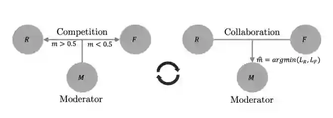 如图2所示,我们将训练分为两个阶段,第一阶段固定调节者M,最小化式1(竞争阶段),第二阶段竞争对手{R,F}形成共识训练调节者M,使其能正确的分割静态场景与运动物体,最小化式2(合作阶段)