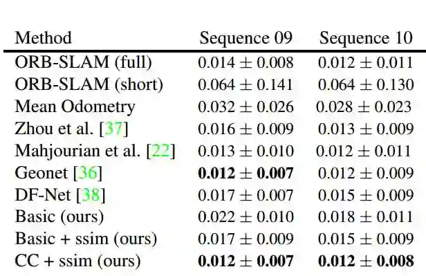 如下表1和表2所示,为我们在KITTI数据集上对单目深度的估计达到了SOTA。如表3所示,相机运动的估计也取得了较好的结果,在序列09和序列10上甚至超过了带有闭环检测的sequence09和10.