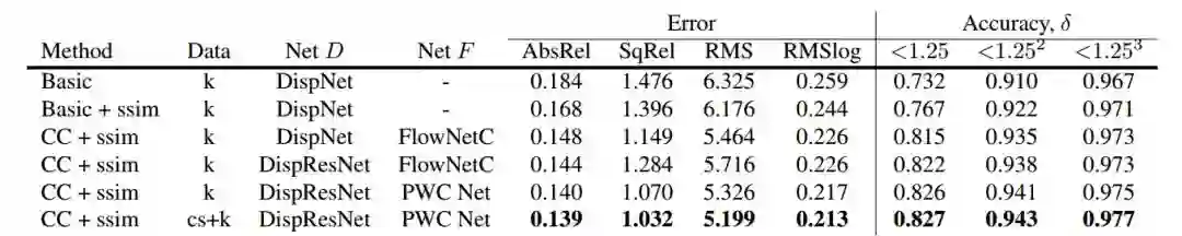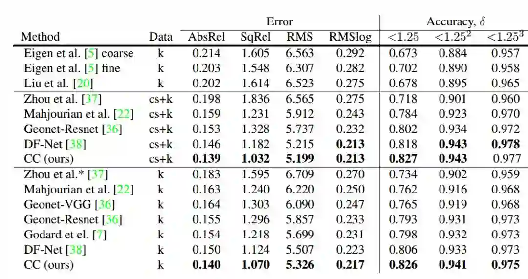 4.实现了无监督学习单一视角深度估计和相机位姿估计的SOTA,实现了无监督学习关于场景几何光流的SOTA,引入了无监督学习运动分割的baseline。