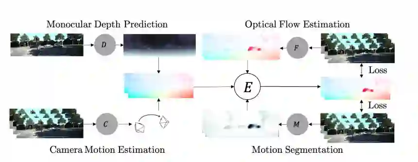 本文解决了几个相互关联的低等级视觉的无监督学习问题:单一视角的深度估计,相机位姿估计,光流,静态场景和移动区域的分割。我们的主要观点是将这四个基本的视觉问题通过几何约束耦合在一起。因此,学习一起解决它们简化了问题,因为解决方案可以相互加强。我们通过利用更明确的几何约束和分割静止场景和移动区域超过了以前的方法。为此,我们引入了竞争协作(Competitive Collaboration),这是一个促进多个专业神经网络协调训练以解决复杂问题的框架。竞争协作的工作方式与期望最大化非常相似,但神经网络既可以作为对应于静态或移动像素的竞争者,也可以作为将像素分配为静态或独立移动的协作者。我们的方法将这些问题集合到一个通用的框架里面,同时解释了将场景分割为移动物体和静态场景,相机的运动,静态场景结构的深度和移动物体的光流。我们的模型采用无监督学习的训练方法,达到了SOTA。