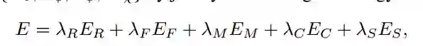 如公式3所示,损失函数由5项组成,其中ER为利用深度和相机位姿计算的光学重建误差,EF为利用光流计算的光学重建误差,EM为标签始终为1的交叉熵,EC为深度估计和光流估计之间达成共识来约束掩膜分割对象的损失函数,ES为局部光滑损失。