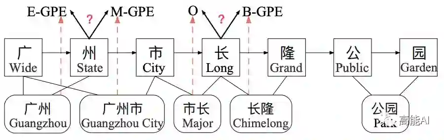 Lattice LSTM采取RNN结构,导致其不能充分利用GPU进行并行化。此外,Lattice LSTM无法有效处理词汇信息冲突问题,如上图所示:字符 [长] 可以匹配到词汇 [市长] 和 [长隆],不同的匹配会导致[长] 得到不同的标签,而对于RNN结构:仅仅依靠前一步的信息输入、而不是利用全局信息,无法有效处理这一冲突问题。显而易见,对于中文NER,这种冲突问题很常见,在不参考整个句子上下文和高层信息的前提下很难有效解决。