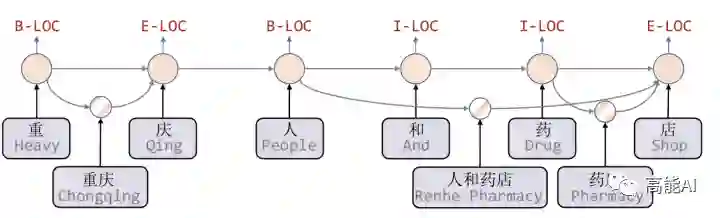 信息损失:1)每个字符只能获取以它为结尾的词汇信息,对于其之前的词汇信息也没有持续记忆。如对于「药」,并无法获得‘inside’的「人和药店」信息。2)由于RNN特性,采取BiLSTM时其前向和后向的词汇信息不能共享。