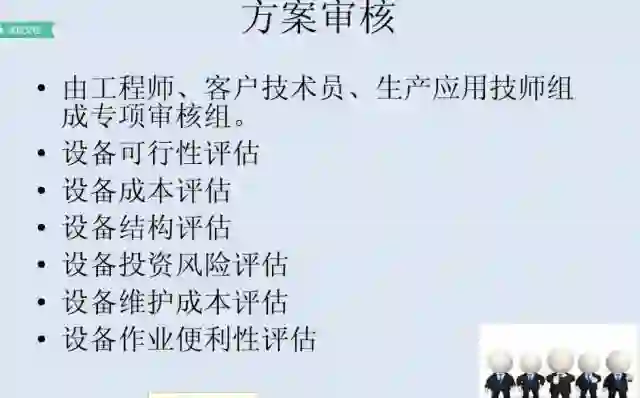 3、方案确认:根据上述两个基本情况,结合可供选择的条件,提出初步可行性方案,供团队集体讨论后,交付给客户确认;(一般这会有几个来回后才能初步定下来)