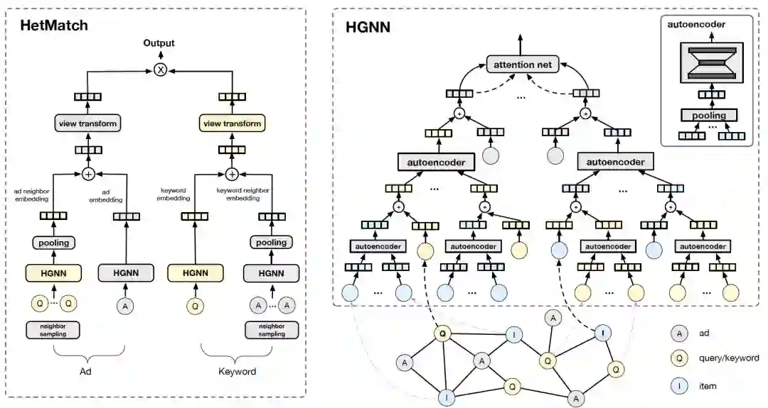 通常在获得语义表征层后,模型会直接计算点积分数并计算 loss 进行优化。在该步骤之前,我们将引入一种孪生匹配网络,来缓解异构图匹配问题中由于不同类型节点的模型参数和 metapath 定义不同,导致 ad 和 keyword 的表征难以分布在同一空间的问题。为了解决这一问题,我们将 ad 和 keyword 的匹配问题改为同构超节点(meta node)的匹配问题,即两组 ad-keyword pair 之间的匹配,保证匹配左右两端结构的同质性。对于 ad 侧,我们通过计算得到 ad 侧的 embedding,以及和 ad 最为相关的 topK 个 keyword 的 embedding 的均值,求和后通过线性变换得到最终的 embedding;keyword 侧的作法也类似。更通俗地说,我们将 ad 及其关联最紧密的 keyword 邻居与 keyword 及其关联最紧密的 ad 邻居进行匹配。