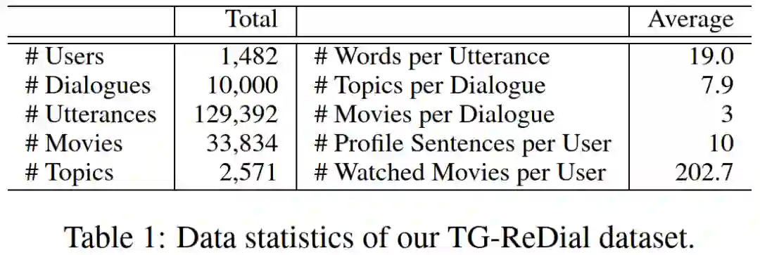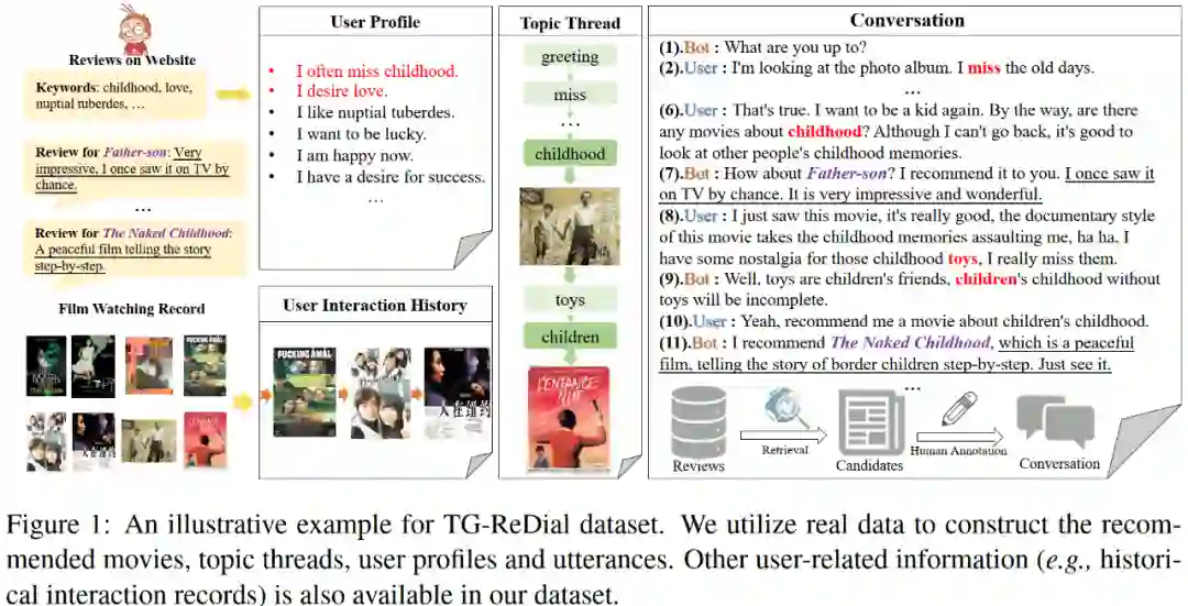 此外,大多数现有的数据集主要关注冷启动场景,缺少历史交互数据,TG-ReDial则提供了用户的profile和丰富的观影历史。