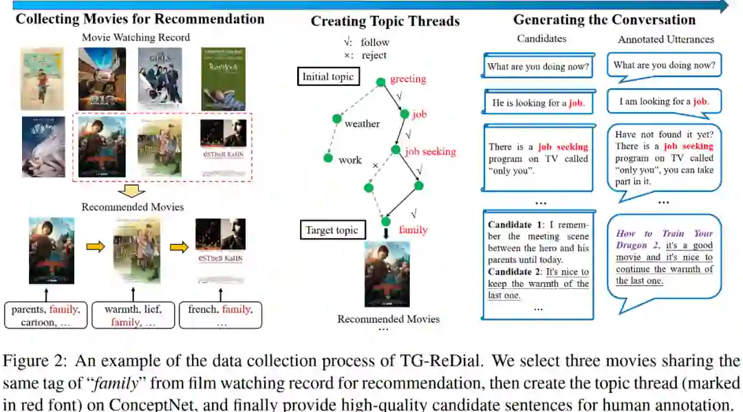 为了解决上述问题,本文提出了一个电影领域的对话推荐数据集TG-ReDial (Recommendation through Topic-Guided Dialog)。它包含1万个完整的对话和近13万条语句,加入了话题线索以实现将用户引导至推荐场景这一语义的自然转移,并且采用半自动的方式构建,保留了用户真实的个性化信息(如交互历史,偏好主题),使得人工标注过程更加合理可控。