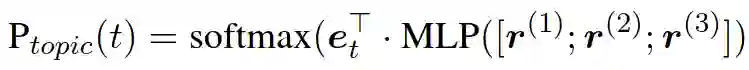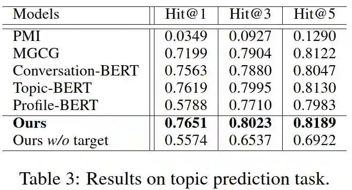 本文分别使用三个BERT[8]来对对话,话题和profile进行编码。对于每个BERT,将对应的文本和候选话题进行拼接,来突出话题的语义。和推荐类似,我们通过计算相似度预测出下一个话题: