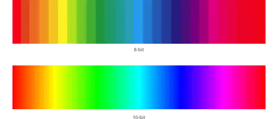 这里的「位/bit」又是什么意思?我们不妨拿 8bit 的 RGB 色彩空间来更深入地展开解释色彩空间。 在 8bit 的 RGB 色彩空间中,R、G、B 每个元素都有 8 位数字,每位数字都是二进制(0 和 1)。但是我们日常生活里更常用的是十进制,将 8 位二进制所有可能取到的值转换为十进制后,我们可以给 R、G、B 赋值的十进制范围就变成了整数范围的 0~255,也就是 2^8=256 个值,总计 16,777,216 种颜色。 而 10bit 的 RGB 色彩空间中,R、G、B 每个元素都有 10 位数字,每位数字都是二进制(0 和 1)。但是我们日常生活里更常用的是十进制,将 10 位二进制所有可能取到的值转换为十进制后,我们可以给 R、G、B 赋值的十进制范围就变成了整数范围的 0~1023,也就是 2^10=1024 个值,总计 1,073,741,824 种颜色。