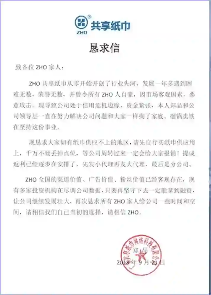 ZHO共享纸巾资金出现问题大概是在今年4月。目前现状就是纸巾供不上,佣金不给返,加盟费不给退。而据代理人透露,ZHO全国大概有上万代理,光代理费就三亿,那么钱都去哪里了?代理人的说法是,绝大部分全在几个负责人手里,包括公司总负责人郑品、法定代表人周文宇等。