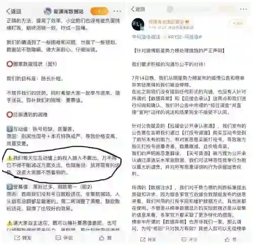据了解,翟潇闻数据站主动曝光了通过第三方渠道打榜的行为,还道出翟潇闻互动值差是因为别家抢囤号,加上本月特殊戒严,导致“轮博”账号价格变高,质量变差。这一行为也被圈内称为“自杀式维权”。