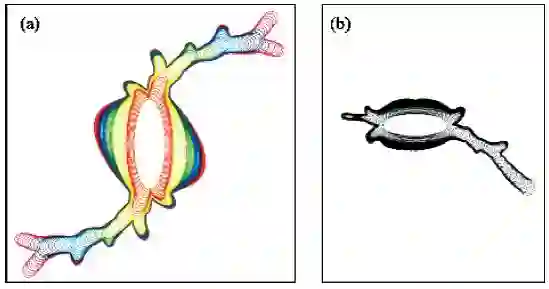 图6(a)是由连续模型的数值模拟给出的生长结果,一个小的圆圈到了一个临界半径时候,变得不稳定,会被拉长,因此考虑初始条件是一个椭圆. 我们给这个椭圆加上一个微小的缺陷(在图中几乎看不见)来模拟噪音的影响. 生长的每一步都在图中表示了出来. 正如图6(a)所示,这个小的初始缺陷导致了两个生长的臂,它们在不断分叉时弯曲,留下一个鳍在弯曲的外侧.