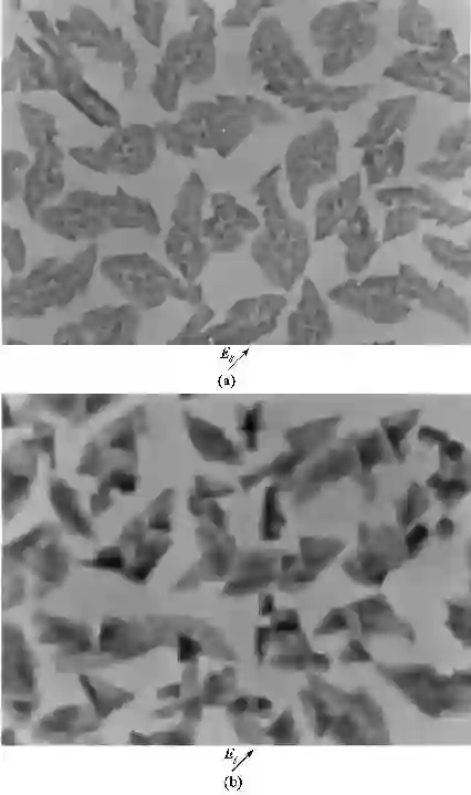 带电+中性粒子模型的合理性被以下事实支持:在ICB 方法中,沉积到基底上的粒子大部分是中性的,其中小部分是带电的. 若静电荷在生长中起重要作用,那么在沉积过程中,在基底上加静电场可能对生长产生影响. 相关的实验是加一个与基底平行的电场E〃,在其他生长条件不变的情况下,得到的结果见图7. 我们在图8(a)和(b)中均发现了不规则的直的形态,它的主轴与外加电场呈一个角度.