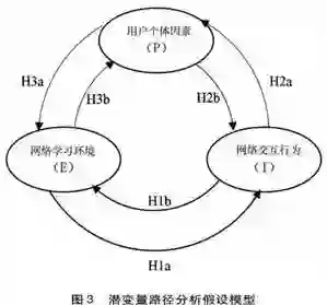 在网络学习中,在线教育资源支持的网络学习环境、网络交互行为、用户个体因素三个因子相互影响,相互作用。资源对网络学习环境的支持影响网络交互行为和用户个体因素;资源对网络交互行为的支持影响网络学习环境和用户个体因素;资源对用户个体因素的支持影响网络交互行为和学习环境。研究对三个内生潜变量做路径分析(见图3),深入分析教育资源设计建设中需优先考虑的因子和因子间的相互作用。研究假设如下: