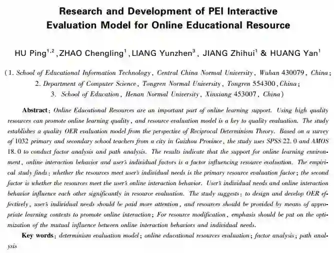关键词:交互评价模型;在线教育资源评价;因子分析;路径分析