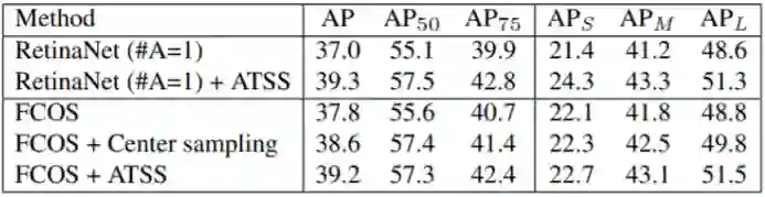 根据下表可以发现,即使 anchor box 数量为 1 的 RetinaNet 和 FOCS 在都加上 ATSS 策略之后,效果都有明显的提升,这也证明了 ATSS 策略的有效性。