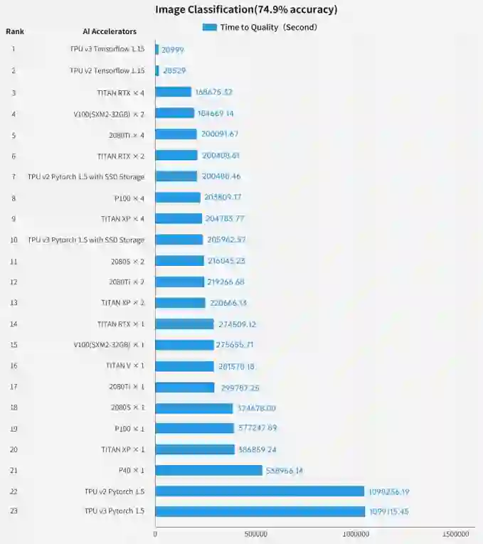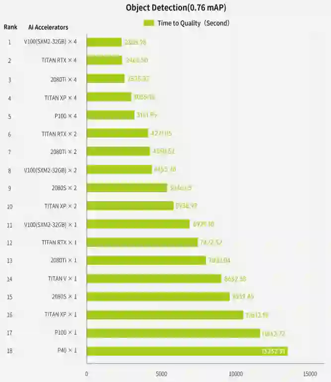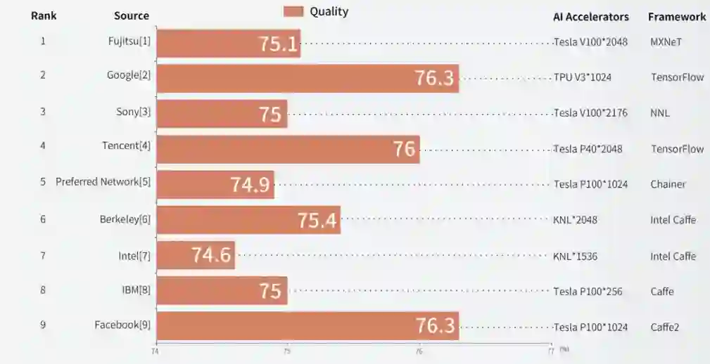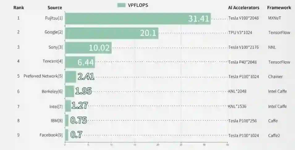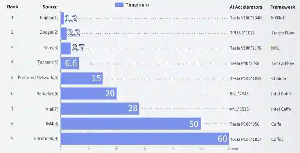 最快的富士通依靠2048块TeslaV100 GPU和新颖的通讯算法优化在1.2分钟完成了图像分类模型训练。