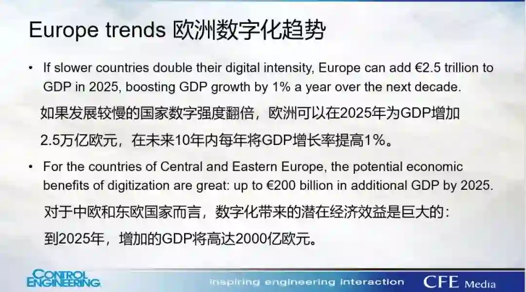 Rozgus主编认为,当前在全球范围内,方兴未艾的数字化转型进程总体上还仅仅处于开端,仍有极具规模的市场潜力有待开发。以美国和欧洲两大市场为例,美国仅开发了其数字化潜力的18%,主要集中在技术部门、媒体、金融及专业服务业;而欧洲也仅开发了其数字化潜力的12%,主要集中在信息和通信技术、媒体及金融业。尤其是对于中欧和东欧而言,到2025 年,数字化能够帮助增加的GDP 将高达2000 亿欧元。