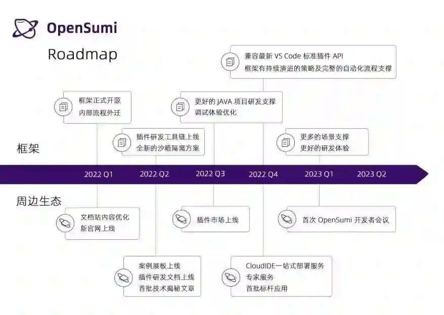 OpenSumi 设计之初就是要兼容 VS Code 插件生态,故我们对于框架会有持续性的要求,开源之后,我们计划每三个月时间去完成一次 VS Code 插件 API 的适配工作,适配计划的制定,将会由相应的版本管理人员组织在讨论区进行,当前已适配至 VS Code v1.60.0 版本标准 API, 进度可见 适配计划 。