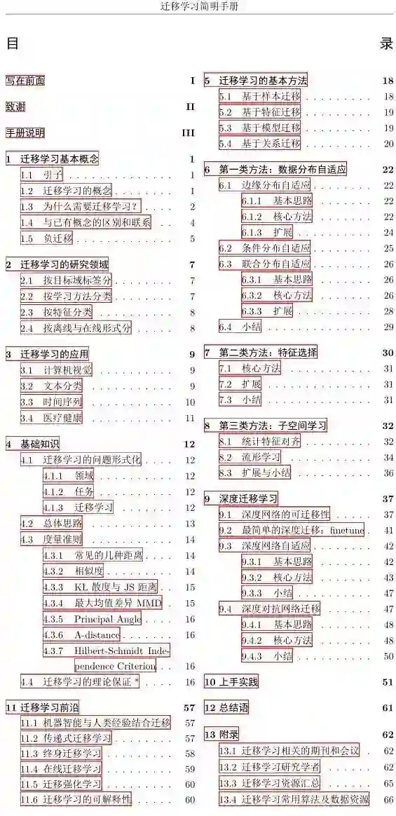 手册一共分为 13 章,包含迁移学习的概念介绍,为什么进行迁移学习,迁移学习的应用领域等基本知识。重点介绍迁移学习的基本方法和代表性研究成果,以及目前最火的深度 (对抗) 迁移学习。我们还特别提供了一章上手实践教程。之后我们对迁移学习进行了展望和总结,并在附录中提供了相关的学习资料。