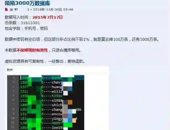 卖家11月30日贴出的交易截图显示,这些数据包括用户的手机号、密码,写入时间是2015年7月17日。