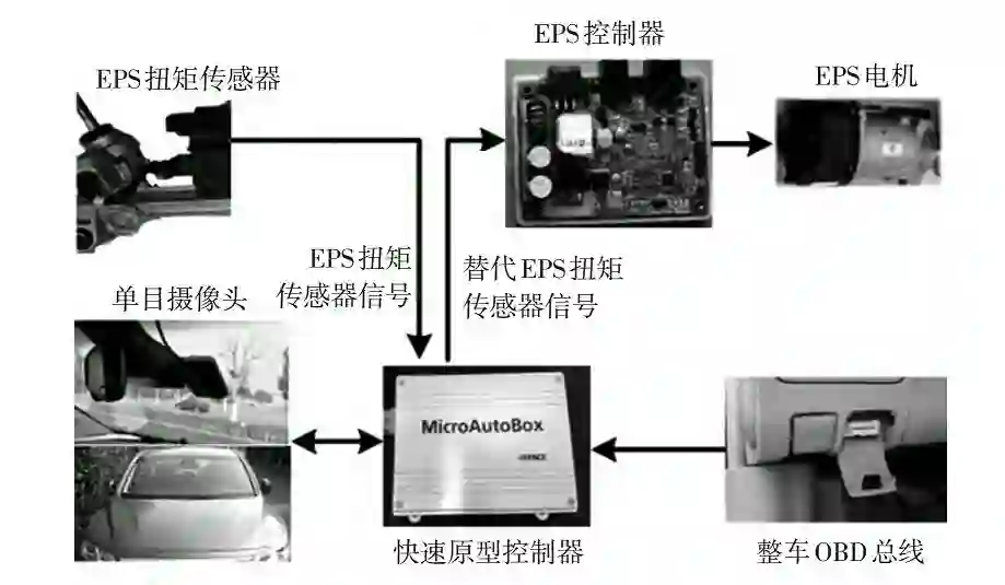 道路试验在如图 15 所示的试验平台上进行,试验车为一款 B 级车。车辆安装了单目摄像头以检测车道线;控制器采用快速原型控制器;为了最大限度地保留原车 EPS 控制器的功能,对 EPS 扭矩传感器信号进行了替代,通过在原扭矩传感器信号上叠加辅助力矩值得到虚拟驾驶员转向力矩,EPS 控制器会根据虚拟驾驶员转向力矩、车速及助力曲线控制 EPS 电机力矩,符合图 1的系统结构。