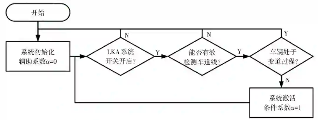 LKA 系统需要具有开关接口以保证驾驶员随时可以开启或关闭系统,避免系统对驾驶员持续产生干扰甚至引发事故。从人机交互装置接收 LKA 系统的开关信号,如果驾驶员关闭 LKA 系统,则激活条件系数 α=0。