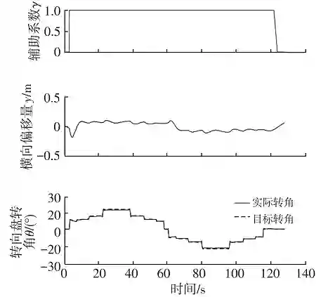 同时,在辅助系数 γ 从 1 降为 0 的过程中,车辆位置的变化可能导致车道跟随力矩 T_ha 的波动,从而使输出的辅助力矩 T_lka 波动,导致驾驶员手感不佳。如图 9 所示,采用选择模块在辅助系数 γ 从 1 降为 0 时切换到记忆模块存储的 T_ha 值,保证输出的辅助力矩 T_lka 在状态切换过程中线性变化,从而保证驾驶员的转向手感舒适。