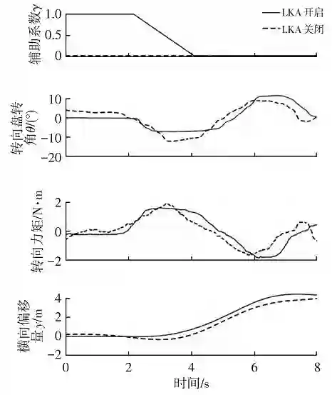 为了验证本文设计的 LKA系统退出过程不对驾驶员产生干扰,在驾驶模拟器上进行了对比试验:驾驶员分别在 LKA 系统开启和关闭的状态下不开启转向灯进行变道超车操作,并记录对比驾驶员转向力矩、转向盘转角和车辆横向偏移量。试验结果如图 14 所示,两种情况下转向盘转角与横向偏移量变化过程接近,LKA 系统退出时扭矩传感器值没有明显波动,驾驶员接管过程平稳,LKA 系统未对驾驶员变道产生明显干扰,验证了LKA 系统退出过程设计的合理性。