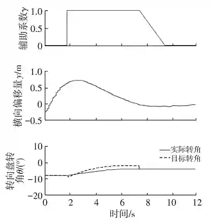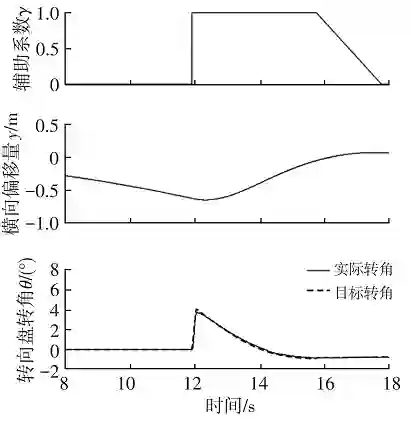 车速 70 km/h 直线道路仿真结果如图 11 所示,车辆逐渐偏离车道,第 12 s 时介入条件满足,辅助系数 γ 由 0 调整为 1,此时车辆偏出车道中心线约 0.7 m,LKA 系统开始介入。转向盘转角变化率受到限制,转角平稳变化,车辆平缓返回车道中心线附近,此后,LKA 系统主动平缓退出。
