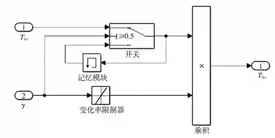 为了便于对系统状态转换的过渡过程进行设计,输出力矩决策单元采用文献 [8] 提出的 LKA 力矩叠加结构。根据工作状态和虚拟车道跟随力矩获得车道保持辅助力矩 T_lka=T_ha·γ。输出力矩决策单元的输入 γ 和 T_ha,输出为 T_lka。当 γ=1 时,LKA 系统输出辅助力矩 T_lka 即为虚拟车道跟随驾驶员力矩 T_ha;当 γ=0 时,车道保持系统输出的辅助力矩 T_lka 为零。