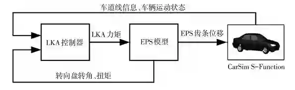 离线仿真结构如图 10 所示,车辆动力学仿真软件提供车辆模型与车道线检测信息,车道保持辅助控制器以及 EPS 系统模型在 Simulink 中搭建,车道线检测质量、转向灯信号等仿真输入也由 Simulink 实现。