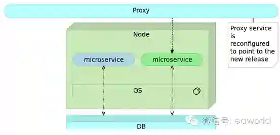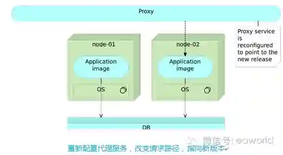 一旦我们完成测试,确保新版本万无一失,那么我们只需要修改代理服务,让访问指向新版本软件即可。旧版本可暂时保留一段时间,供可能的回滚使用。但对用户来说,旧版本已经不复存在了。