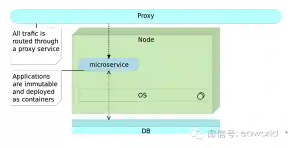 首先我们启动一个反向代理,指向已经完成的完全自给自足的不可变应用程序包。这个程序包可以是虚拟机,也可以是容器。这个不可变的镜像显而易见有别于可变应用。此外,还会有一个代理服务,服务器并不会直接暴露,代理服务会将所有访问(traffic)发送(route)到最终的目标位置。