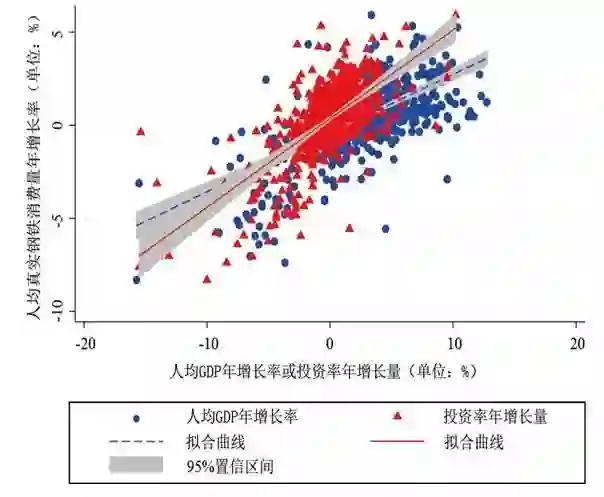 图1. 人均真实钢铁消费量年增长率与人均GDP年增长率、投资率年增长量的关系