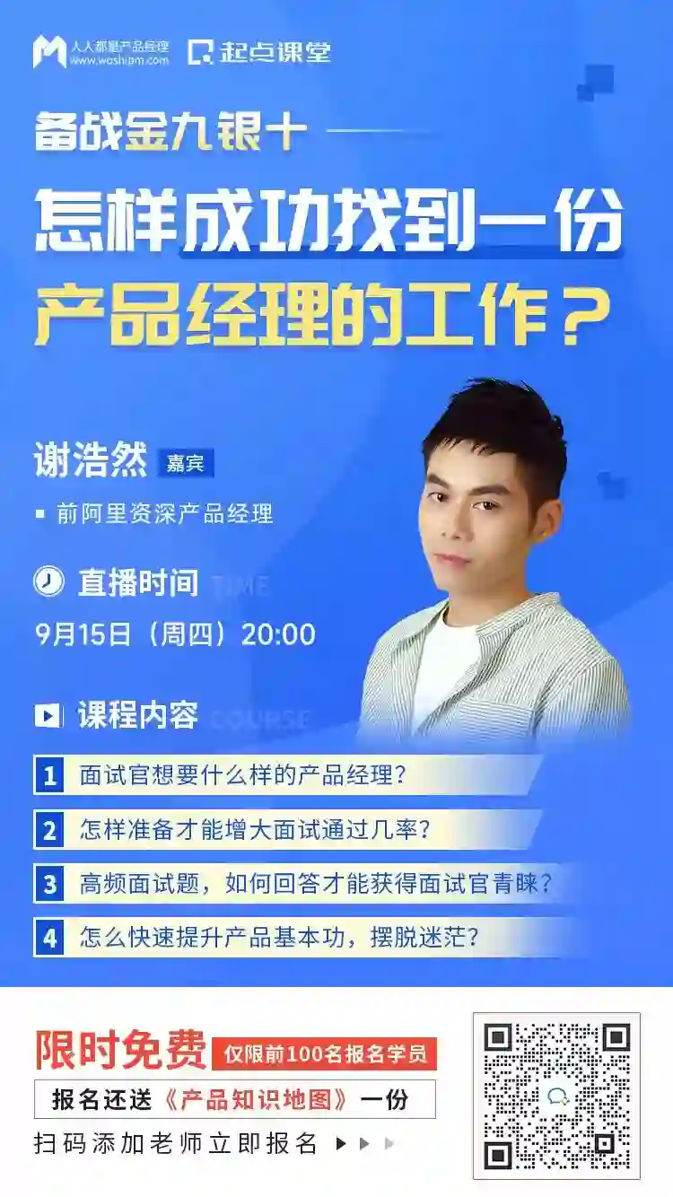 我们邀请了前阿里资深产品经理@谢浩然老师,1小时在线直播,给大家分享产品面试中的高频问题和破题思路,助你顺利拿到产品offer!