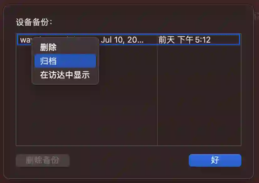 备份完成后,可以点击下方「管理备份」按钮,查看备份记录。右键点击备份,选择归档,确保该备份不会被后续新备份覆盖。然后你就可以安装准备新系统了。