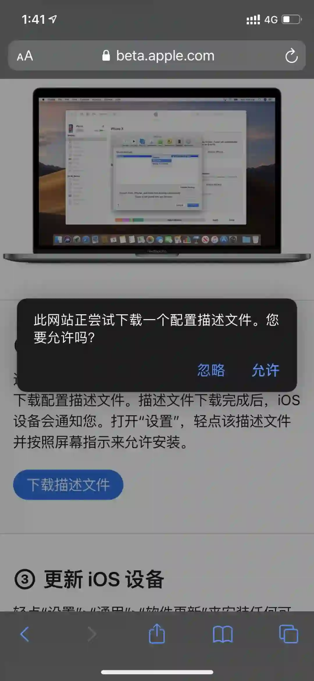 如果你需要升级 iPhone / iPad,请使用 iPhone / iPad 访问 Apple Beta 版软件计划页面并点击注册按钮,然后跟随引导完成注册。之后,在页面中下载描述文件,系统会提示安装配置描述文件,点击「允许」。