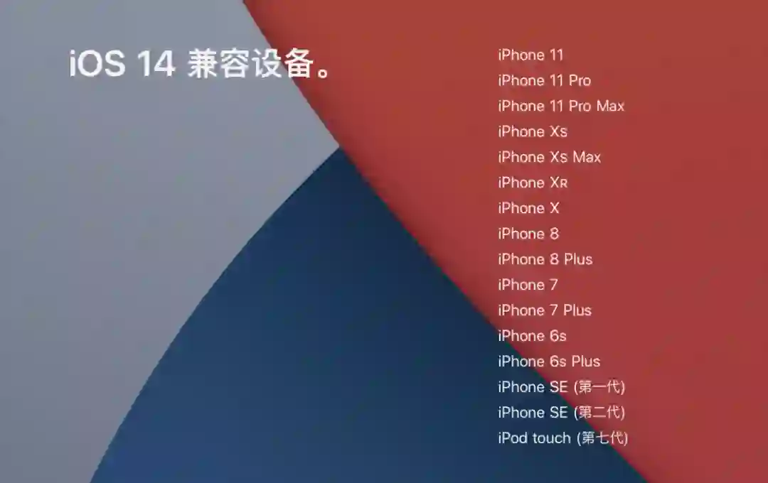 据 Apple 官网提供的信息,iOS 14 支持 iPhone 6s / 6s Plus (2015 年) 以及之后推出的产品,另外还支持第七代 iPod touch。