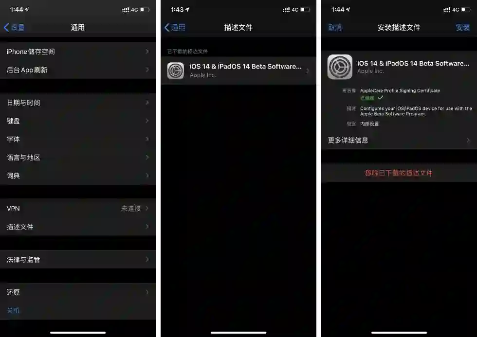 在系统设置中找到「通用 - 描述文件」选项,选择刚刚下载的描述文件,点击「安装」,输入设备锁屏密码并同意安装协议,重启你的 iOS 设备。之后,你就可以在「设置 - 通用 - 软件更新」中更新设备了。