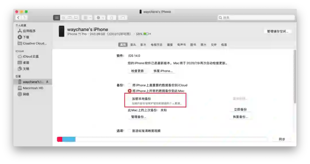 如果你的 iCloud 空间有限,还可以选择用 Mac 上的 Finder 或者 Windows 上的 iTunes,在电脑本地备份系统数据。为了保证数据传输的稳定性和效率,我们推荐你使用有线连接的方式连接电脑和手机、平板设备,而不要使用无线方式进行连接和备份。如果你希望备份账户密码、健康应用和 Homekit 中的数据,请勾选「加密本地备份」。之后选择立即备份,等待备份完成。