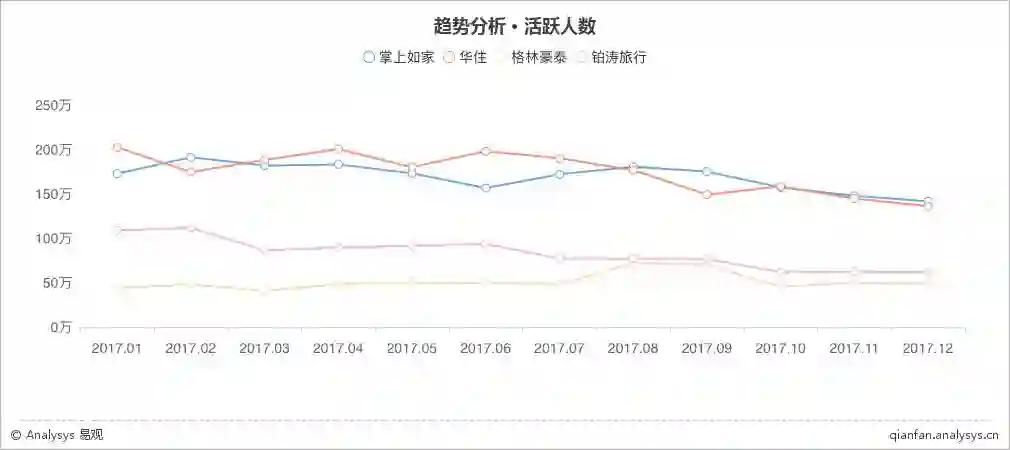 线下酒店方面,掌上如家、华住、铂涛旅行、格林豪泰的月活跃人数都受季节性影响出现了小幅的环比下降。其中掌上如家和华住分别以141.59万和136.08万月活跃用户领跑线下酒店App。纵观全年,线下酒店度过了较为平稳的一年,但厂商间的份额之争仍然激烈。根据易观千帆监测数据显示,掌上如家和华住全年都处在交替领先的状态。铂涛旅行虽然对格林豪泰保持领先优势,但两者差距在四季度逐渐缩小。面对如此激烈的竞争,各厂商如何保持竞争优势呢?