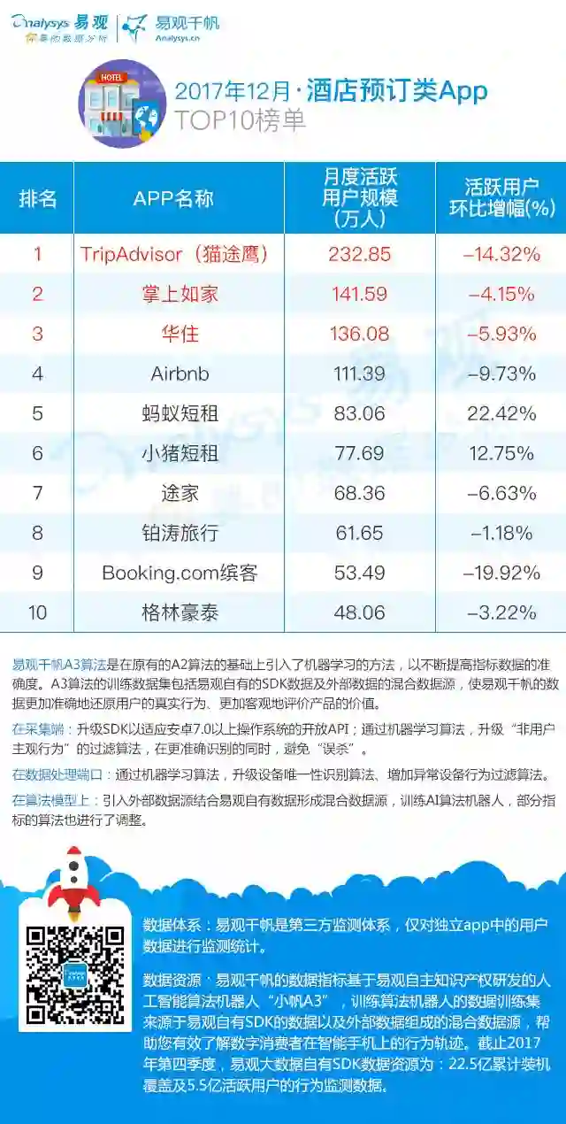 2017年,我国星级酒店营收略有下降,行业并购重组、转型案例增多。许多新势力趁机崛起:零售品牌宜家、无印良品、网易严选等纷纷开设生活美学酒店,拉开了零售业场景化销售新模式;Airbnb、途家、小猪发起非标住宿融资竞赛;高端酒店盈利预期下调、经济型酒店同质化严重刺激中端酒店崛起……在互联网渗透率不断提高的2017,互联网思维与技术加速着酒店业的资本、业务、模式的变革。那么互联网如何改变了酒店业? 我们从易观千帆12月监测的酒店预订类AppTOP10榜单来一窥究竟。