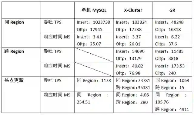 而且,Galera 的同步使用 GCache,而不是 binlog,这对于已有的外部配套系统不是很友好,如果同时又开启 binlog 的话会额外付出存储和 IO 的代价。GR 对于分区的运维不够友好,被隔离的节点无法自动加回集群, 在 WAN 下表现一般,官方也不推荐在这种网络环境下的部署。 X-Cluster 继承了 AliSQL 的优势,又特别优化了 WAN 下的性能。对于同一行数据更新,相比 Galera 和 GR 的表现,而 X-Cluster 的性能完全满足阿里的预期,这在类似于秒杀的场景下会非常有用。除此之外,X-Cluster 继承于 AliSQL,因此除了支持 InnoDB 引擎之外还支持 Rocksdb 引擎,可以有效的优化存储成本。
