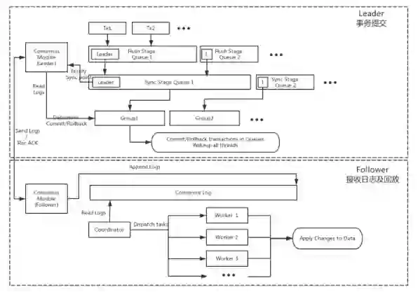 为了保证集群数据的一致性以及全球部署的能力,在事务提交、日志复制回放以及恢复上 X-Cluster 都进行了重新设计。