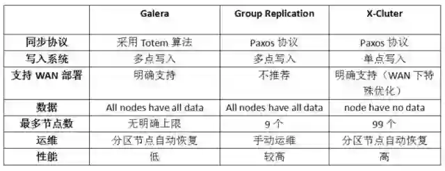 运维方面:Galera 和 X-Cluster 支持分区节点自动恢复而 GR 需要手动运维;