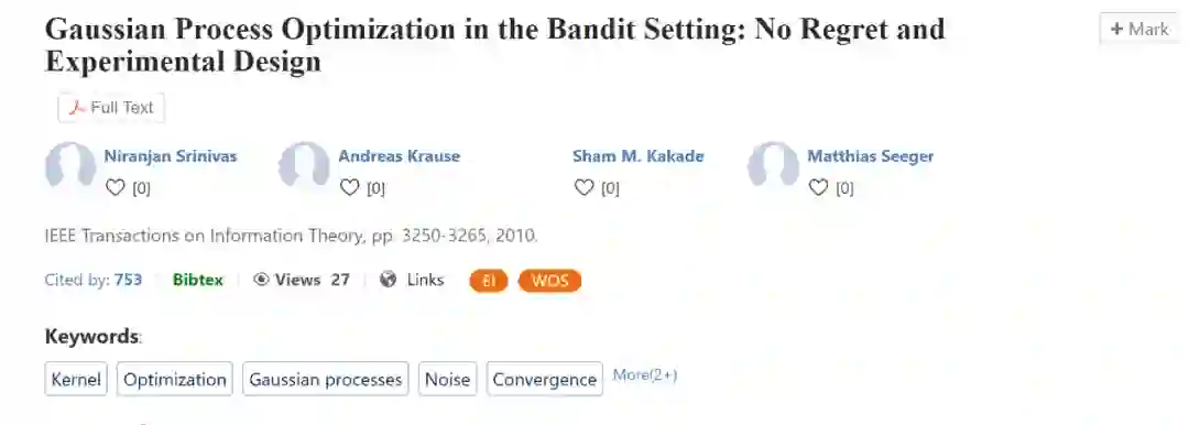 ICML 官方给出的评价为:“本文通过对高斯过程 bandit 优化的分析,将 Bayesian 优化、bandits 和实验设计等领域结合起来,提出了一种基于互信息增益量的有限样本后悔界的新方法。这篇论文在过去十年中产生了深远的影响,包括方法本身、所使用的证明技巧和实际效果。这些都丰富了我们的社会,激发了从理论到实践的无数后续作品的创造力。”
