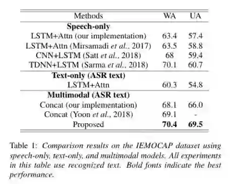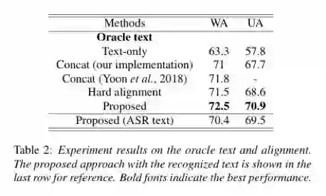 在实验中,论文选择 1)直接通过语音信号特征 2)通过语音识别的文本特征 3)融合音频-文本的多模态特征这三类方法的对比,通过上图(Table 1),可以看出本论文的模型在加权精确度(WA)和非加权精确度(UA)评价指标都有显著提高,证明了学习音频和文本对齐信息的多模学习方法的有效性。