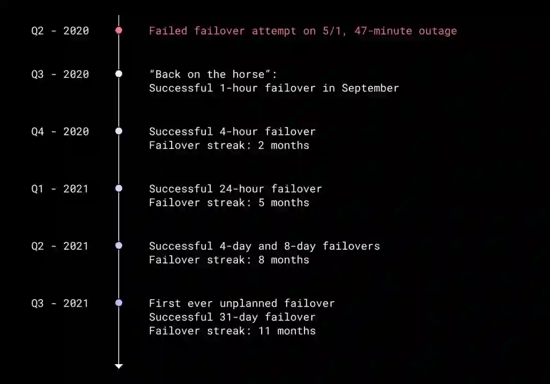 从 2020 年到 2021 年,我们的故障转移能力不断提升,灾难准备团队则着手推进第二个关键里程碑:转向真正的主动 - 被动架构。